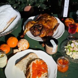 Pre-order only for 25.12 and 31.12! Whole duck, Olivier salad with shrimp, caviar, pâté, whipped butter, bread, stollen, infused liqueur