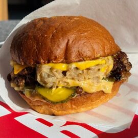 Булочка бріош, соус часниковий, американська гірчиця, подвійна котлетка з аргентинської яловичини, сир чеддер та багато цибульки стерлінг